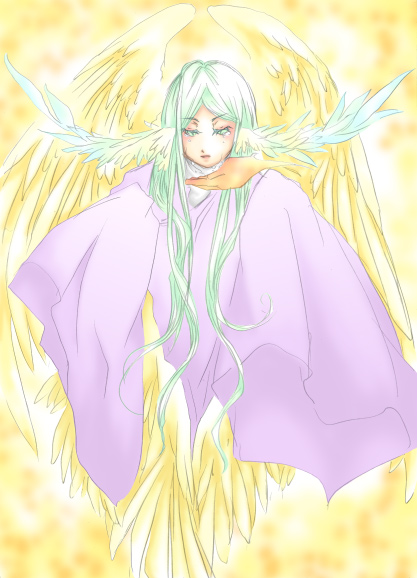 私の好きな天使「イスラフィール」。こちらもイスラムの天使ですね。 私の持っている本によると、「イスラフィールは一日6回地獄を見てはその有様に涙を零すので、アラーが拭ってやらないと地上に洪水が起こる」とか書かれておりましたので、この絵はそれを意識してみました。 イスラフィールは全ての創造物の中で最も美しい顔をしていて、千の言葉でアラーを讃え、アラーはその息吹から天使を作りだすそうです。正直このあたりも私の心を掴んだポイントだったりしますv (でもそのわりに美しく描けてないとかそういうことは置いときましょう・笑) なんか、羽の色と背景色が混ざっちゃったので、イスラフィールだけの絵もこっちに。 ちなみに、イスラフィールは音楽の天使であり、最後の審判を司る天使でもあり、最後の審判の時には死者の魂の入った角笛を吹いて復活させるそうです。 |